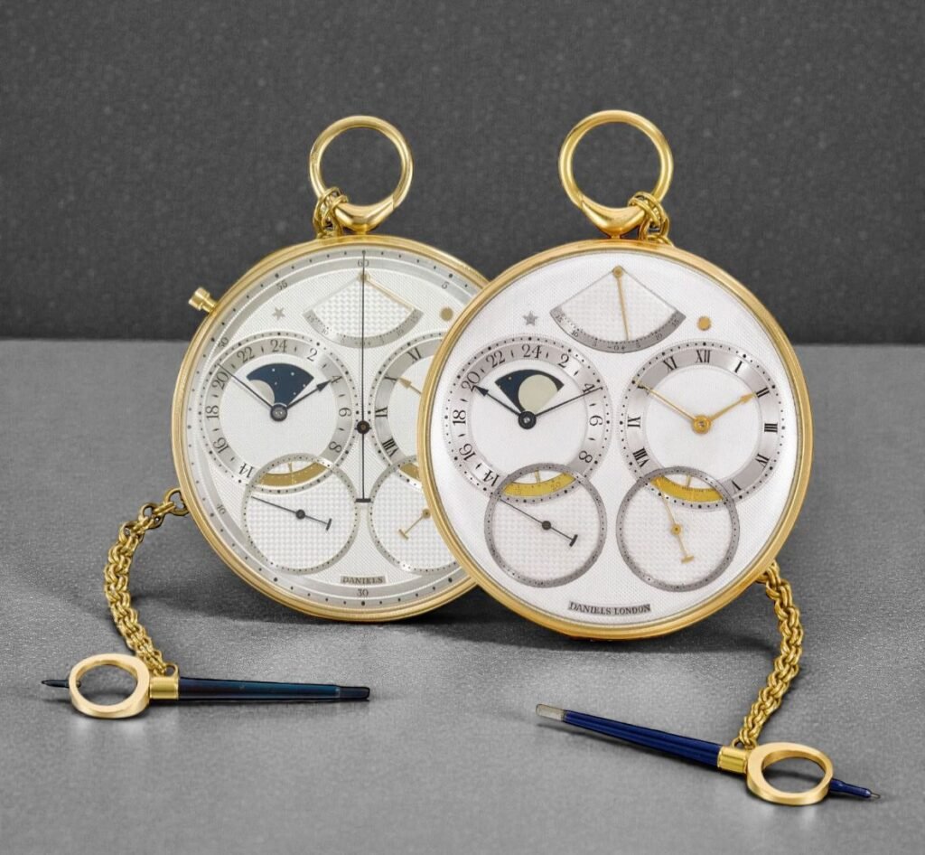 During his career, Daniels produced only about 37 watches entirely by hand, each representing hundreds of hours of work. Among his most famous creations is the “Space Traveller,” a double-escapement pocket watch simultaneously displaying mean solar time and sidereal time. Sold for over $4.5 million at auction, it illustrates the complexity and ingenuity of his work. His watches are characterized by exceptional finishes and innovative complications, often presented in gold cases with classic proportions.